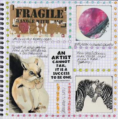 So when Creative Crafty Friends issued the prompt for daily art journaling, I thought about this book. A square Rhodia graph notebook. With every set of two pages glued together. Nothing fancy. January first. I did actually draw those zebras. And I had them put on a business card which is what I attached on the bottom of this page.