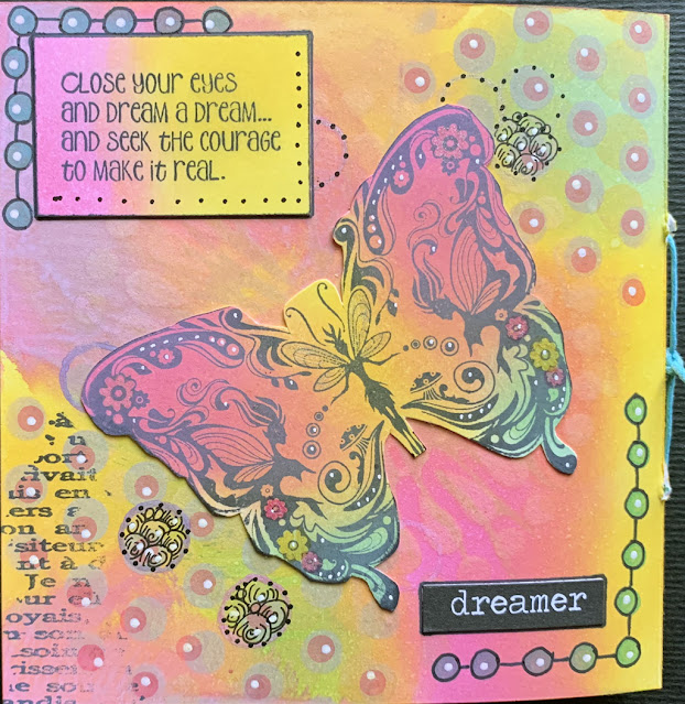 * Do not stamp images directly into book. Stamp them on one of the scraps with color added, then adhere into book where it should go. At least one of my images is kind of lost in a dark background. Without a flashlight. Scary.