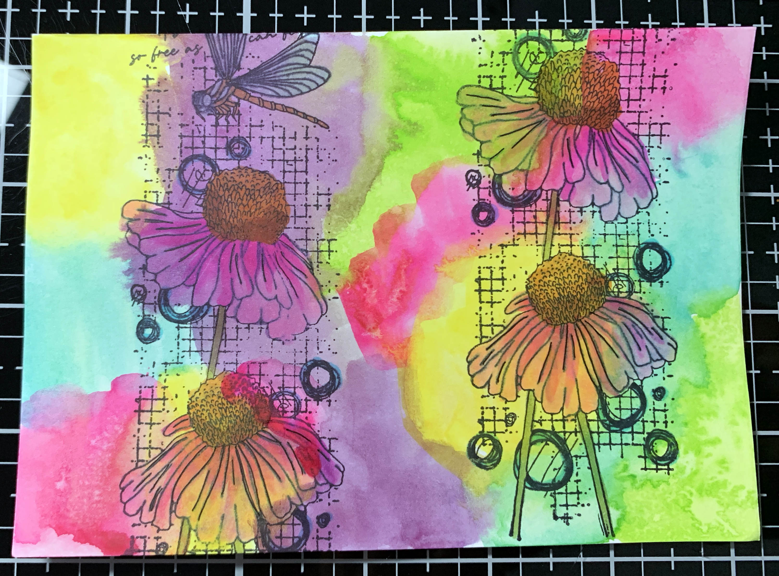 Next I used a really cool stamp from Studio Light to add some background texture by way of flowers and insects. Just one long stamp used twice on the postcard. Then I used some of those same watercolors to paint the flowers.